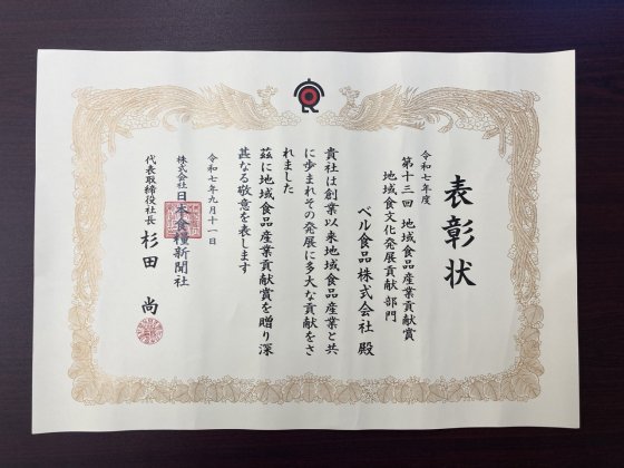 ベル食品は、2025年8月に発表された日本食糧新聞社制定「令和7年度・第13回地域食品産業貢献賞」を受賞し、9月11日(木)に東京・第一ホテル東京にて行われた贈呈式に出席いたしました。